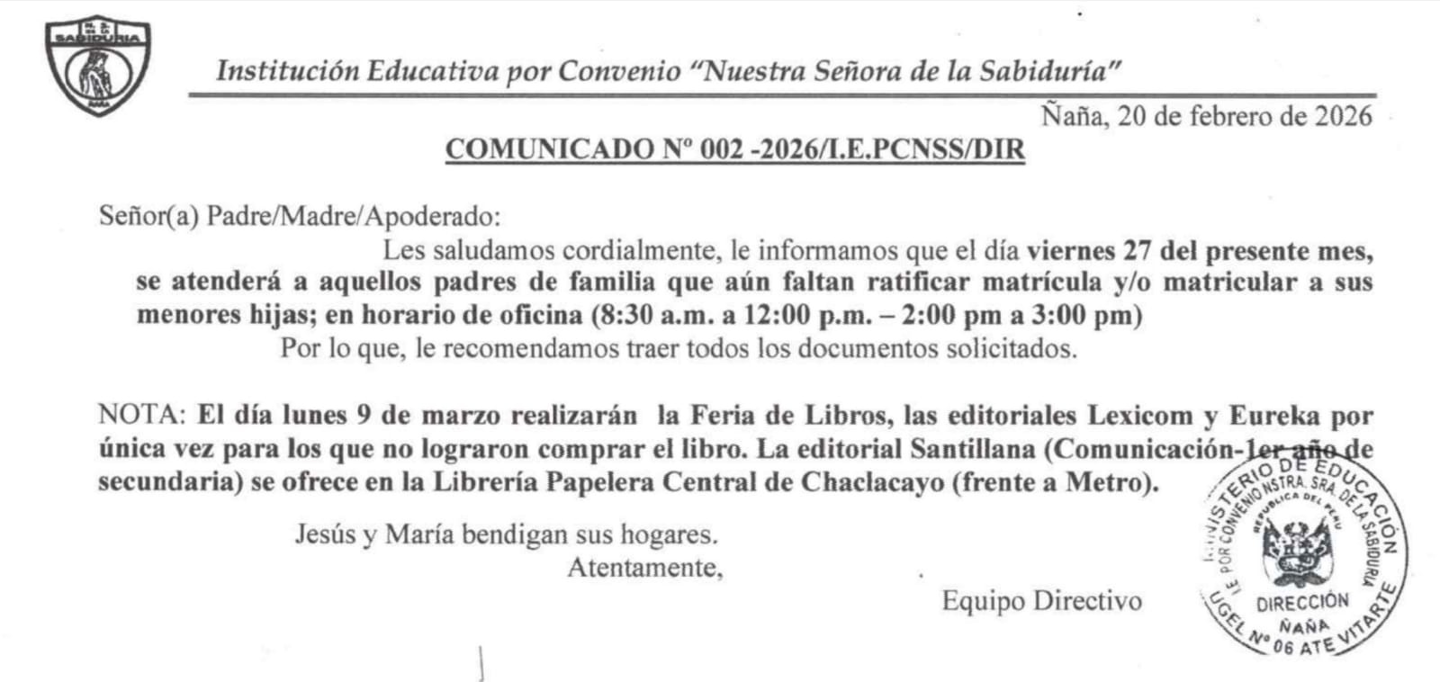 Ratificación de matrícula 2026. Viernes 27 de febrero. Ver comunicado.